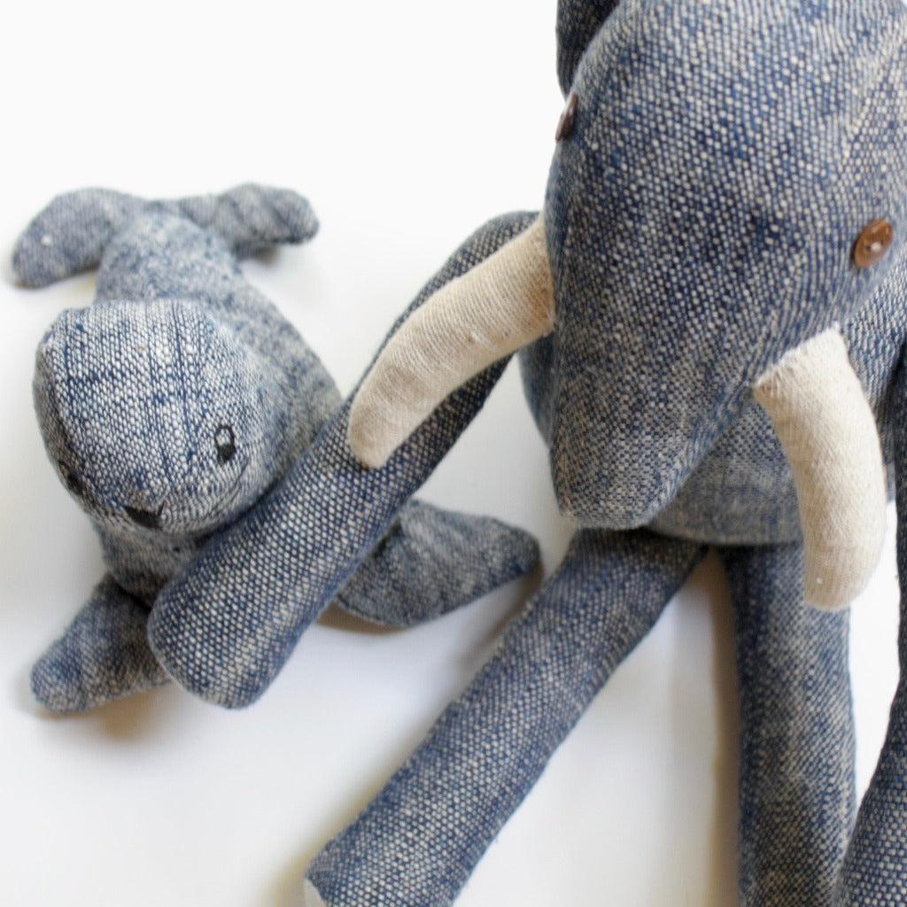Fait main par nos artisans locaux, nos peluches sont confectionnés avec du coton naturel teint de manière traditionnelle à l'aide de plantes, ici de l'indigo