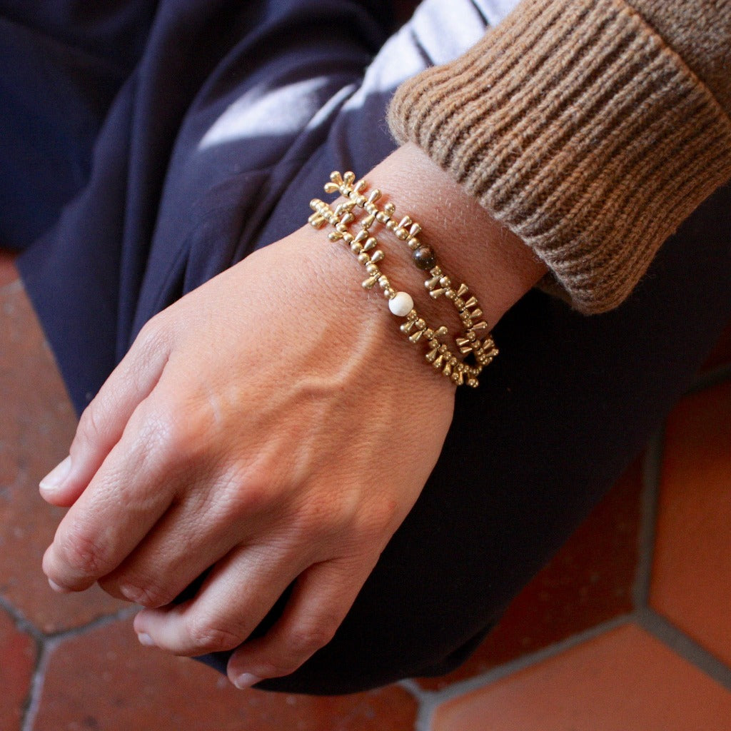 Bracelet doré et pierre naturelle pour cette nouvelle pièce qui vient allier la jolie couleur du laiton qu'on a travaillé comme du corail et la douceur des pierres naturelles