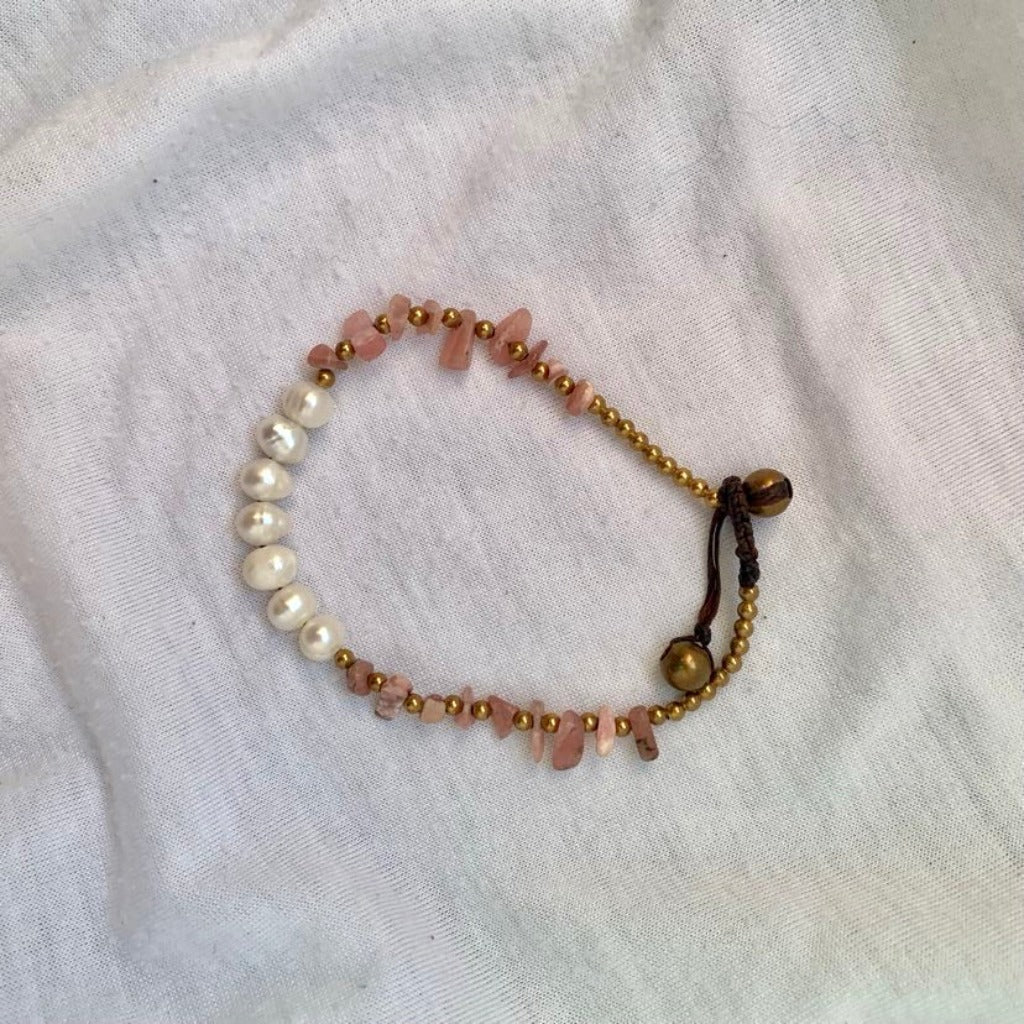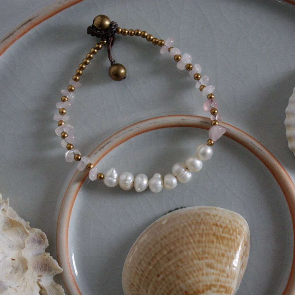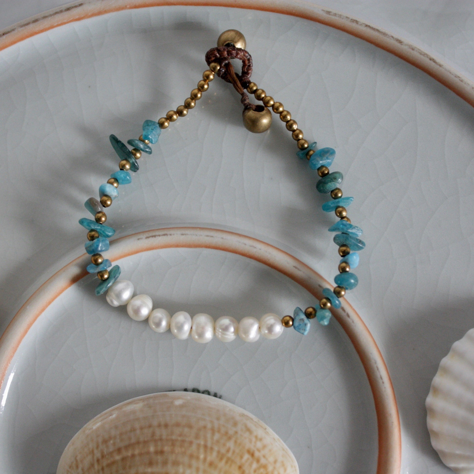 Bracelet duo perles de culture et pierres naturelles monté sur un fil de coton ciré. Un bijou très doux comme une balade sur une plage