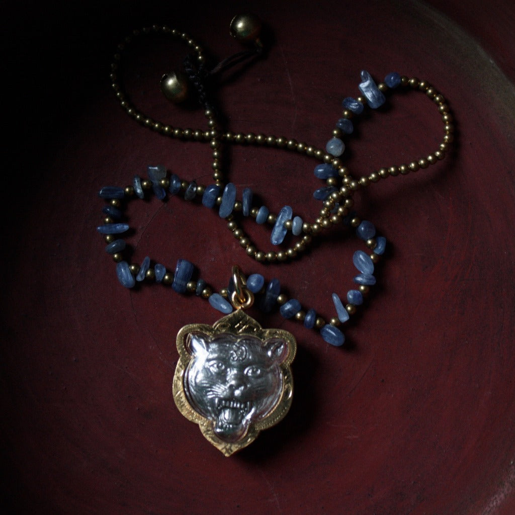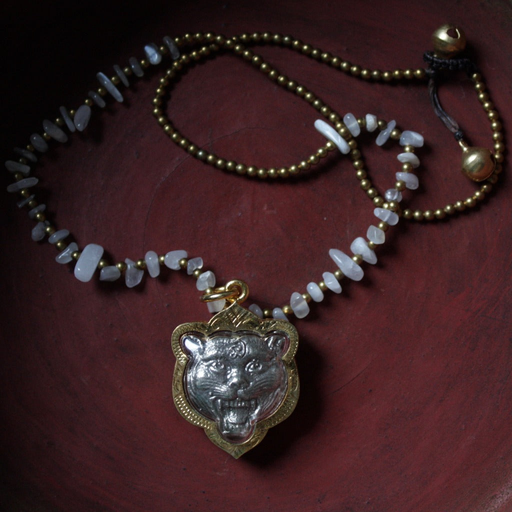 Découvrez notre collier amulette tigre, notre bijou fantaisie fétiche. Inspiré par la tradition thaïlandaise, ce collier arbore la majestueuse figure du tigre, symbole de force et de protection. Montée sur un collier en pierres naturelles, elle devient un de nos bijoux préférés qu'on porte sur un t-shirt blanc ou une jolie robe en fonction des occasions