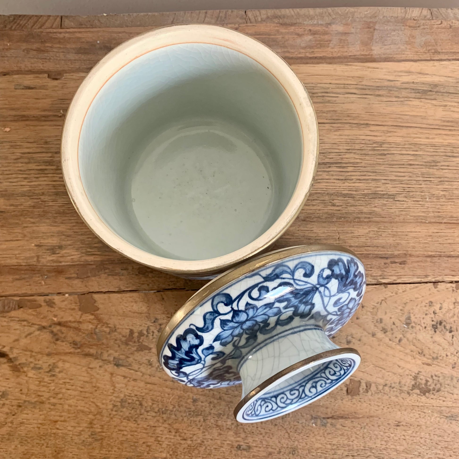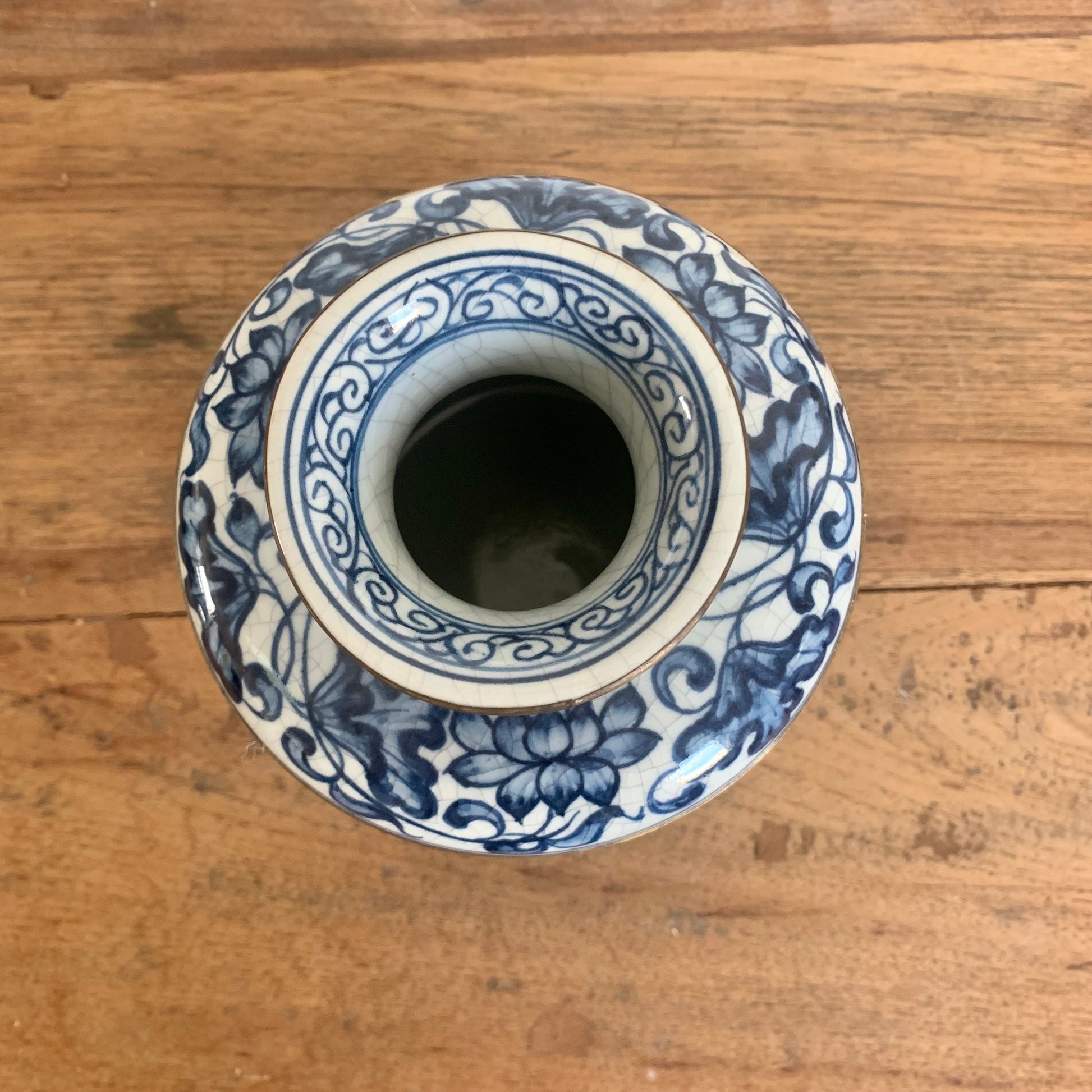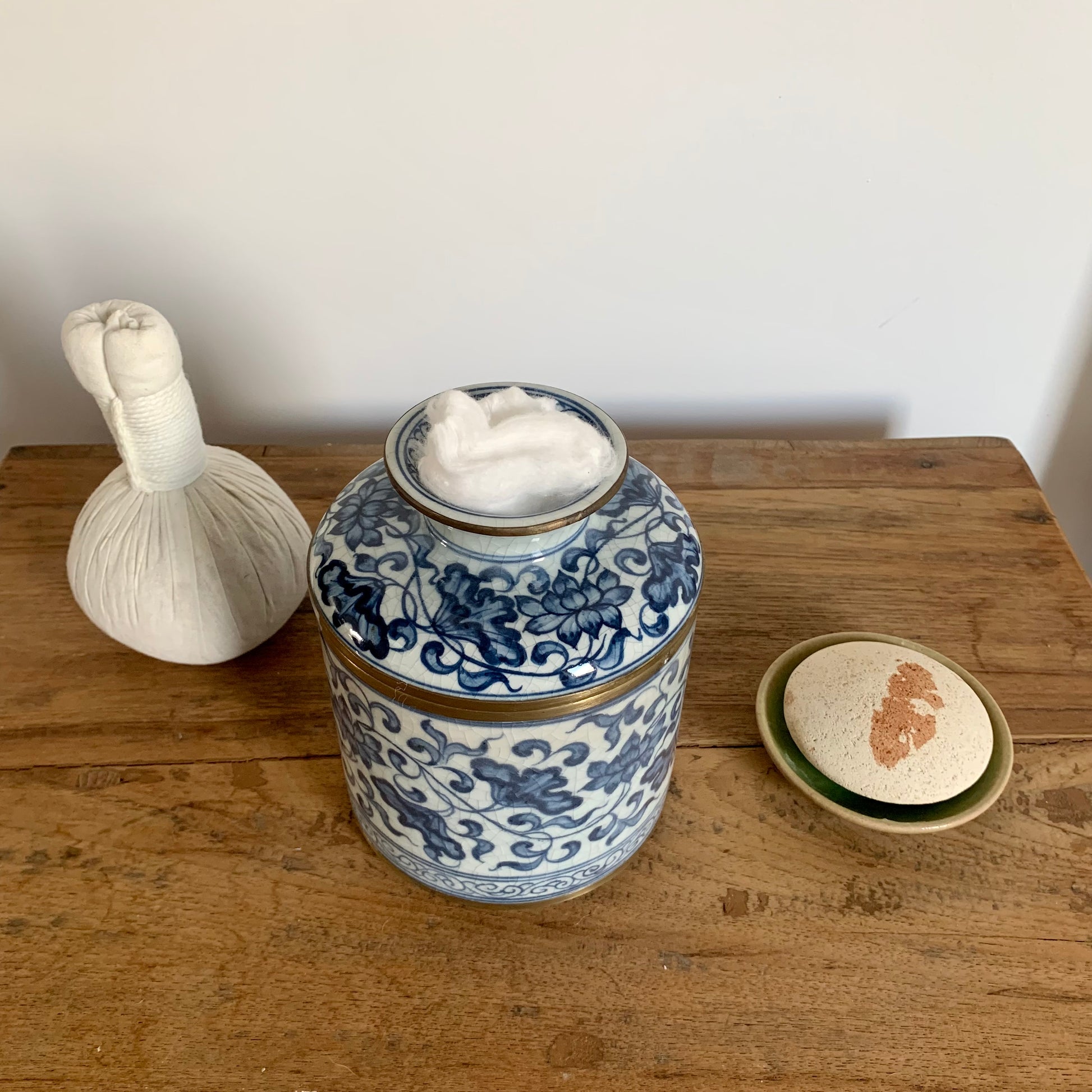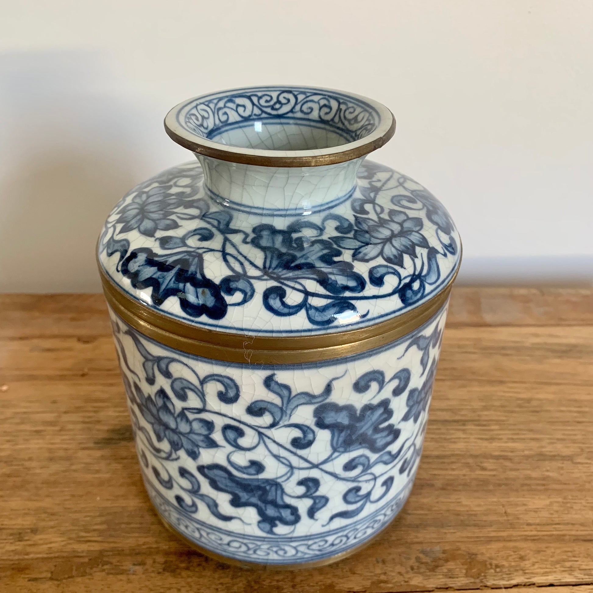 Cette jarre fait main ornée de motifs indigo est un accessoire de décoration unique