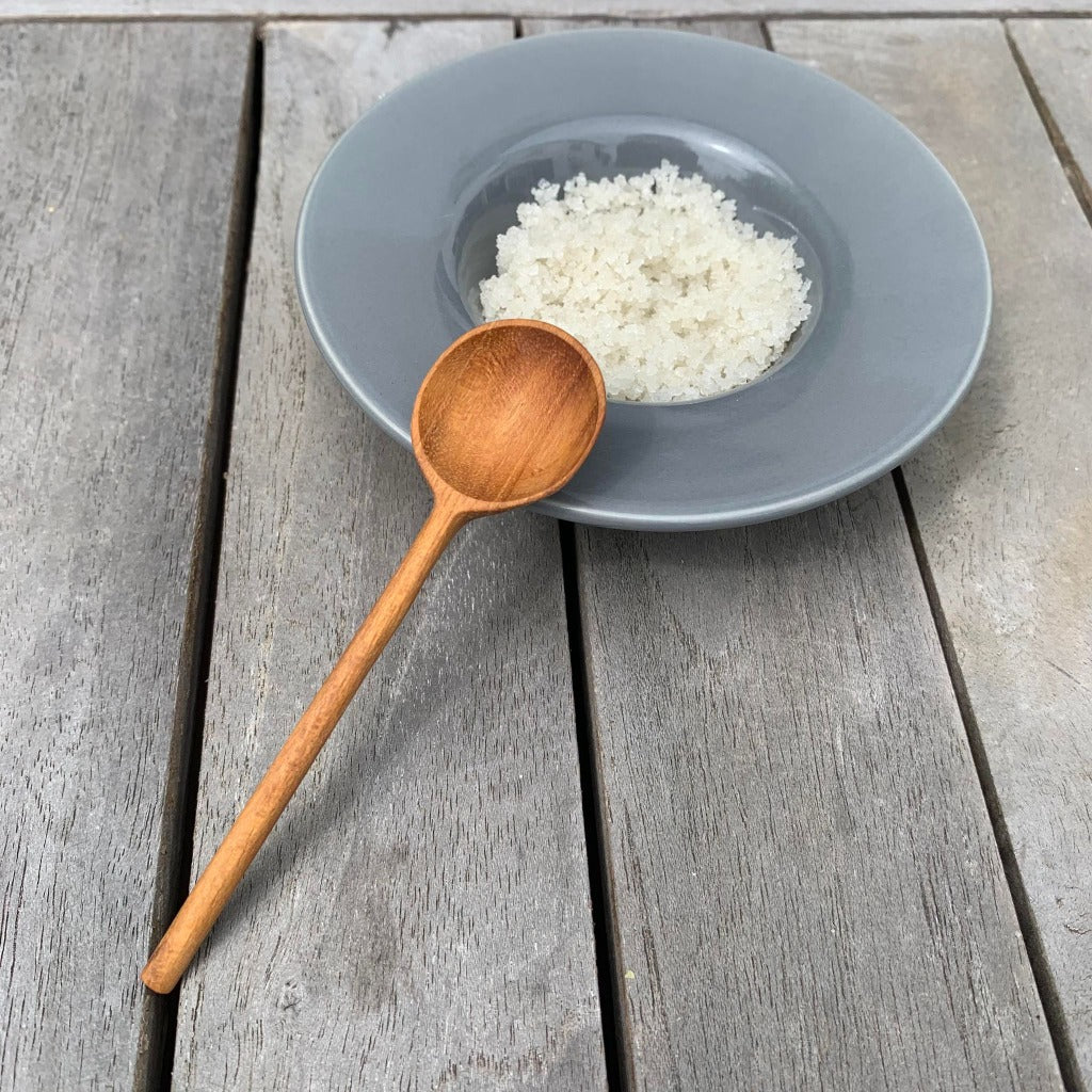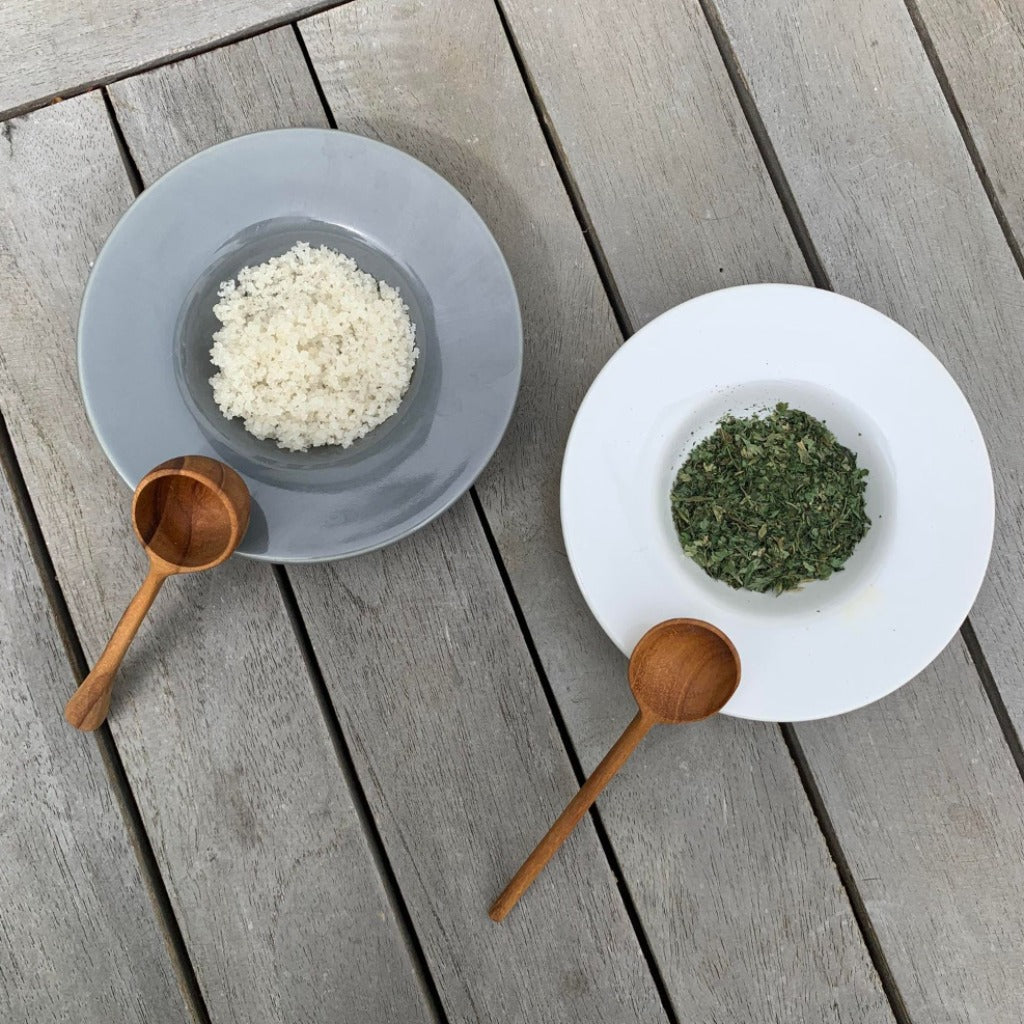 Nos petites cuillères en bois de tek qui viennent se glisser dans nos bols a épices.