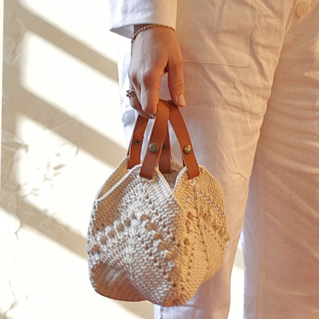 Sac en crochet fait main – Coton crème et anses cuir