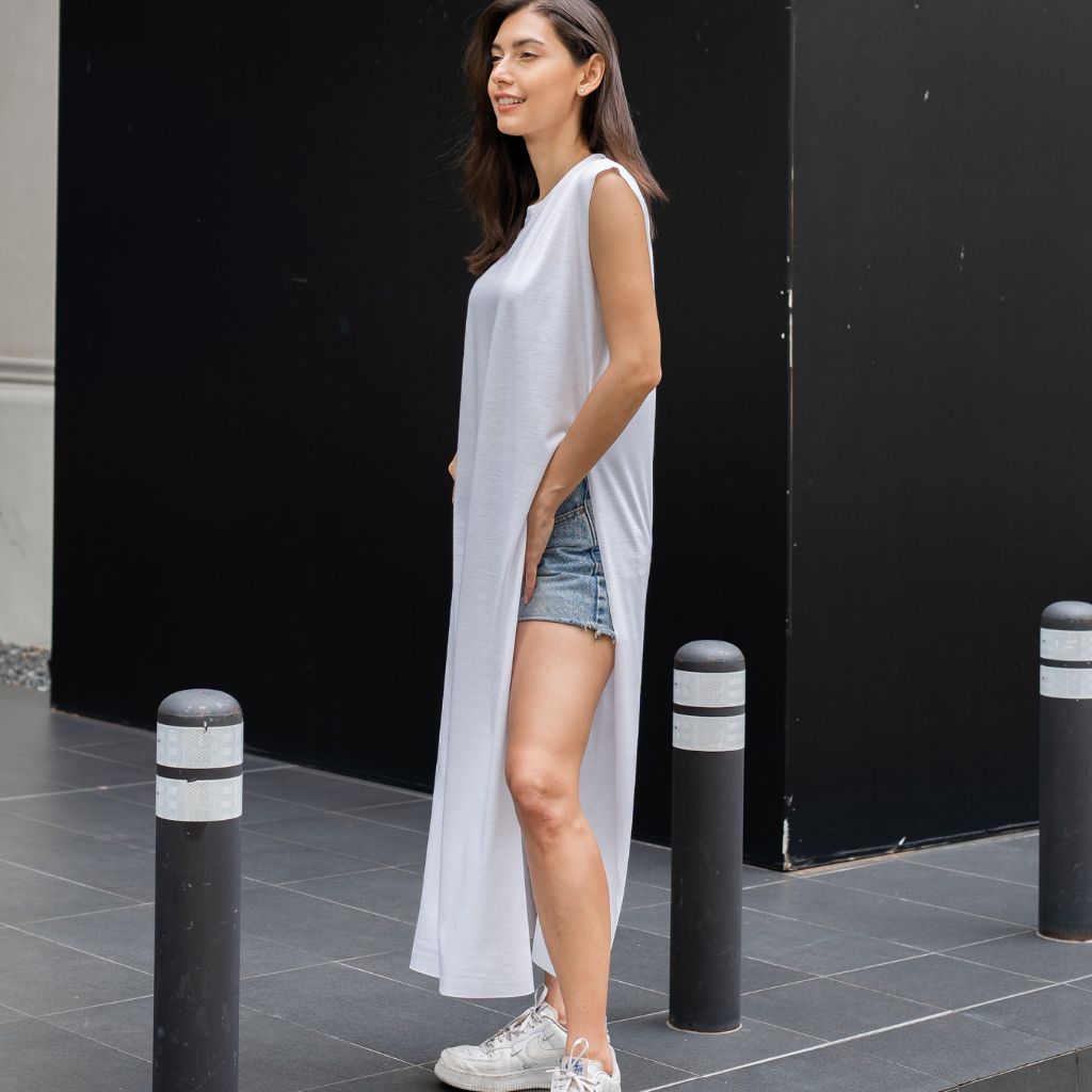 La tunique est confectionnée avec soin en utilisant des techniques de coupe au laser, ce qui permet de créer une pièce légère, fluide et délicate.